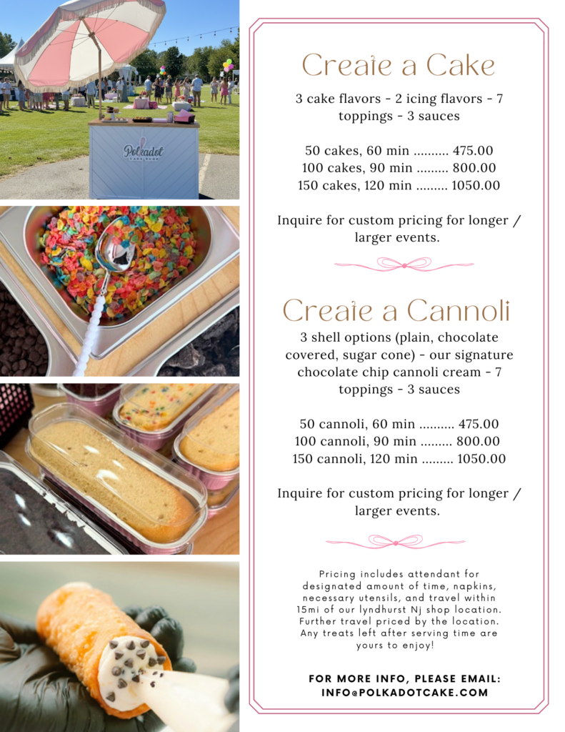 The Cake Cart by Polkadot is the perfect sweet addition to any event, big or small. With indoor and outdoor set up options, the Cake Cart is an interactive and customizable way to make dessert, and your event unforgettable.